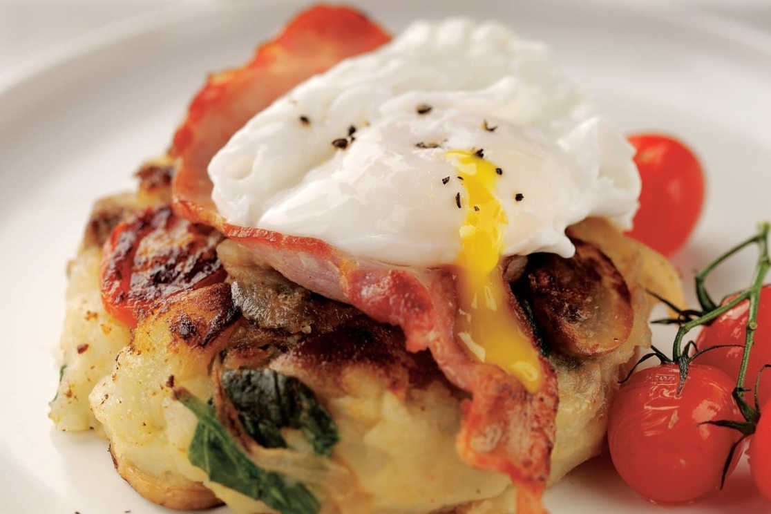 - Divide the potato hash into 4 rounds. Heat the remaining oil in a large frying pan and fry the hash rounds for 2 minutes on each side.