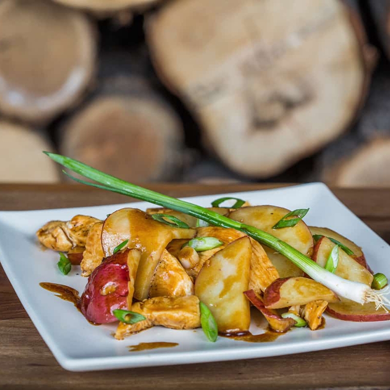 - While potatoes are cooking, in a large skillet toss and brown chicken in oil over high heat 5 minutes. Add potatoes; sauté and toss until potatoes are lightly browned. Add onions and teriyaki sauce, toss until heated through.