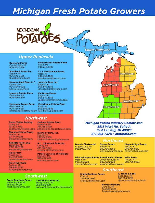 Michigan potato growers offer a wide selection of quality potato varieties — Russet, Round White, Red and Yellow. Our ideal location means Michigan suppliers can deliver a fresher locally grown product often within 48 hours the entire year.
